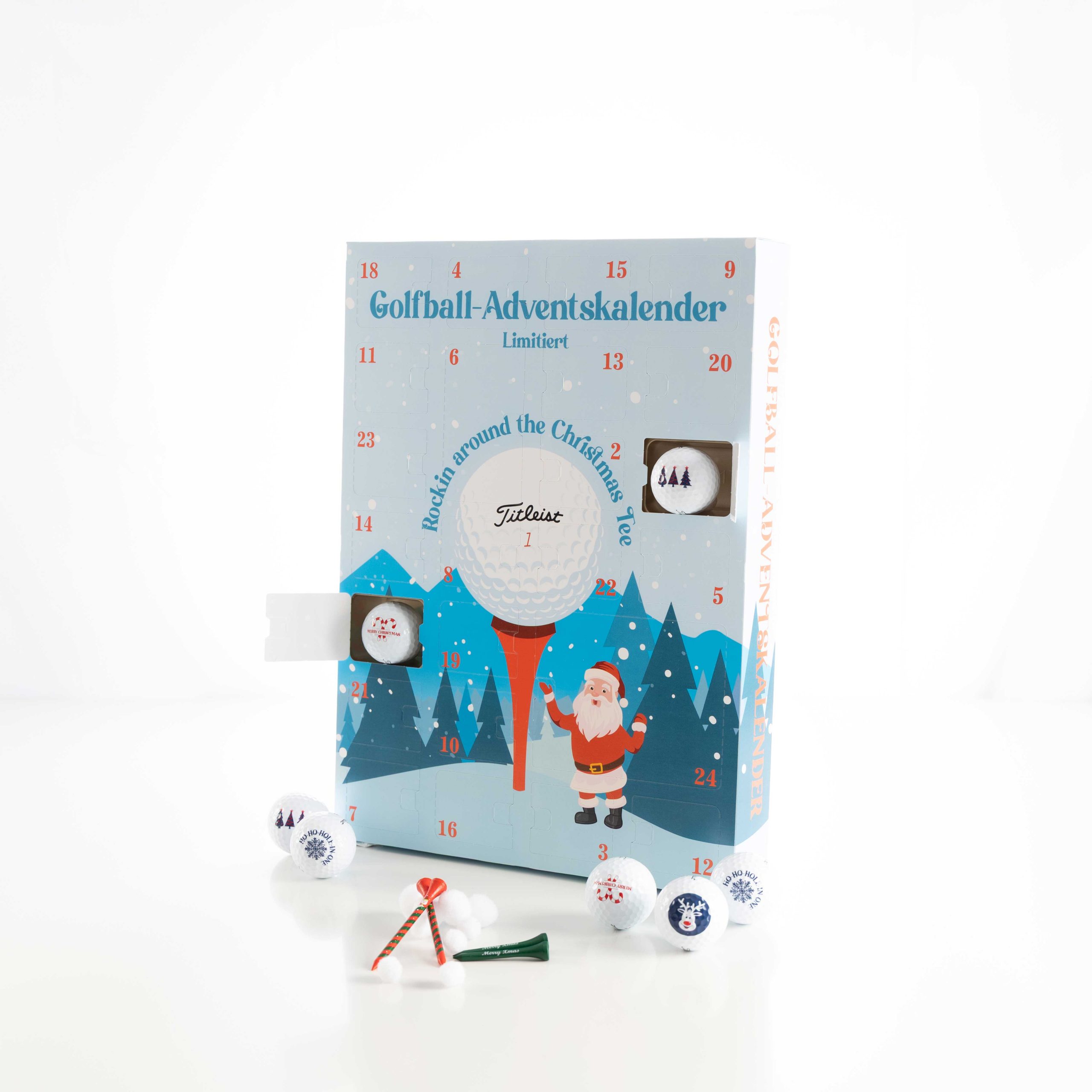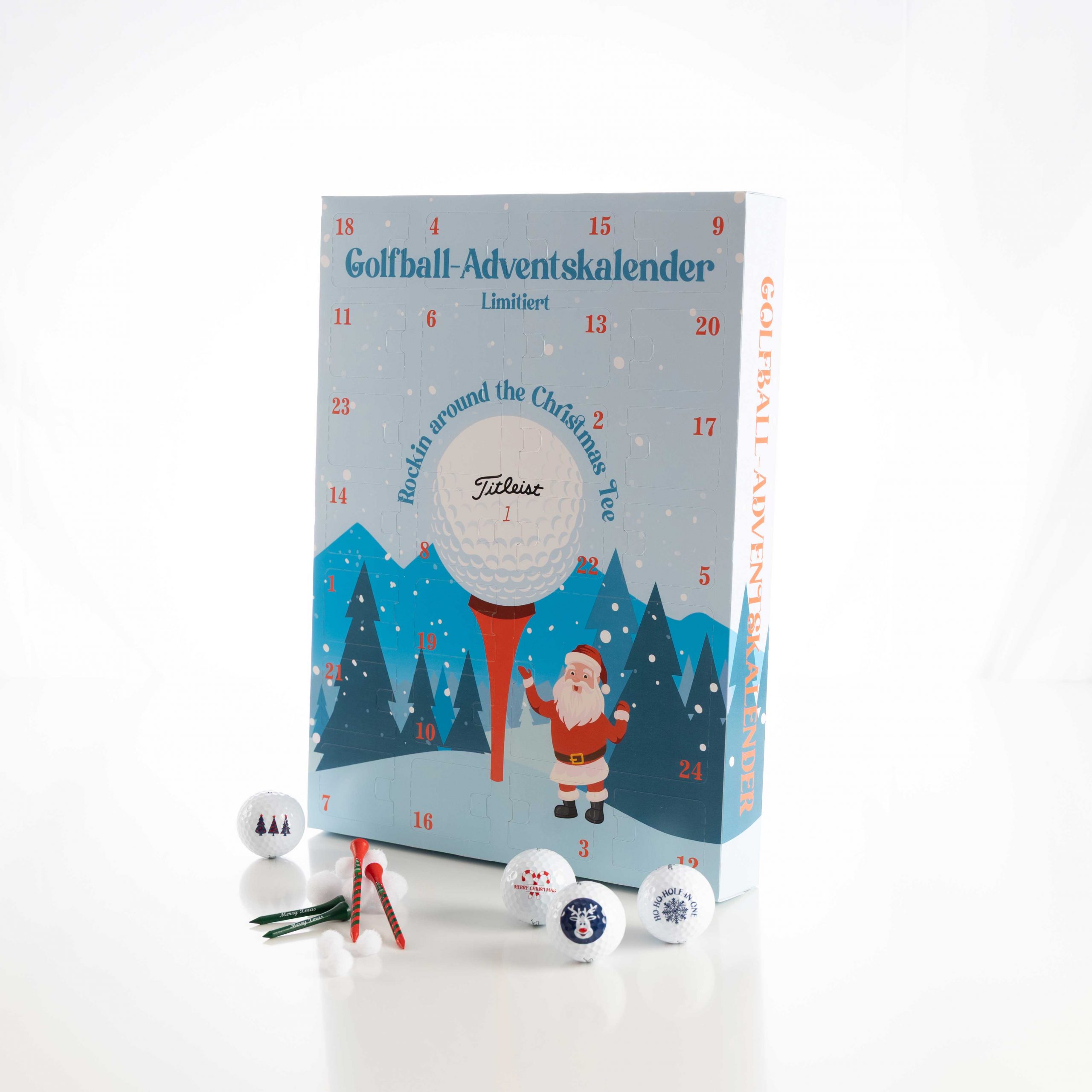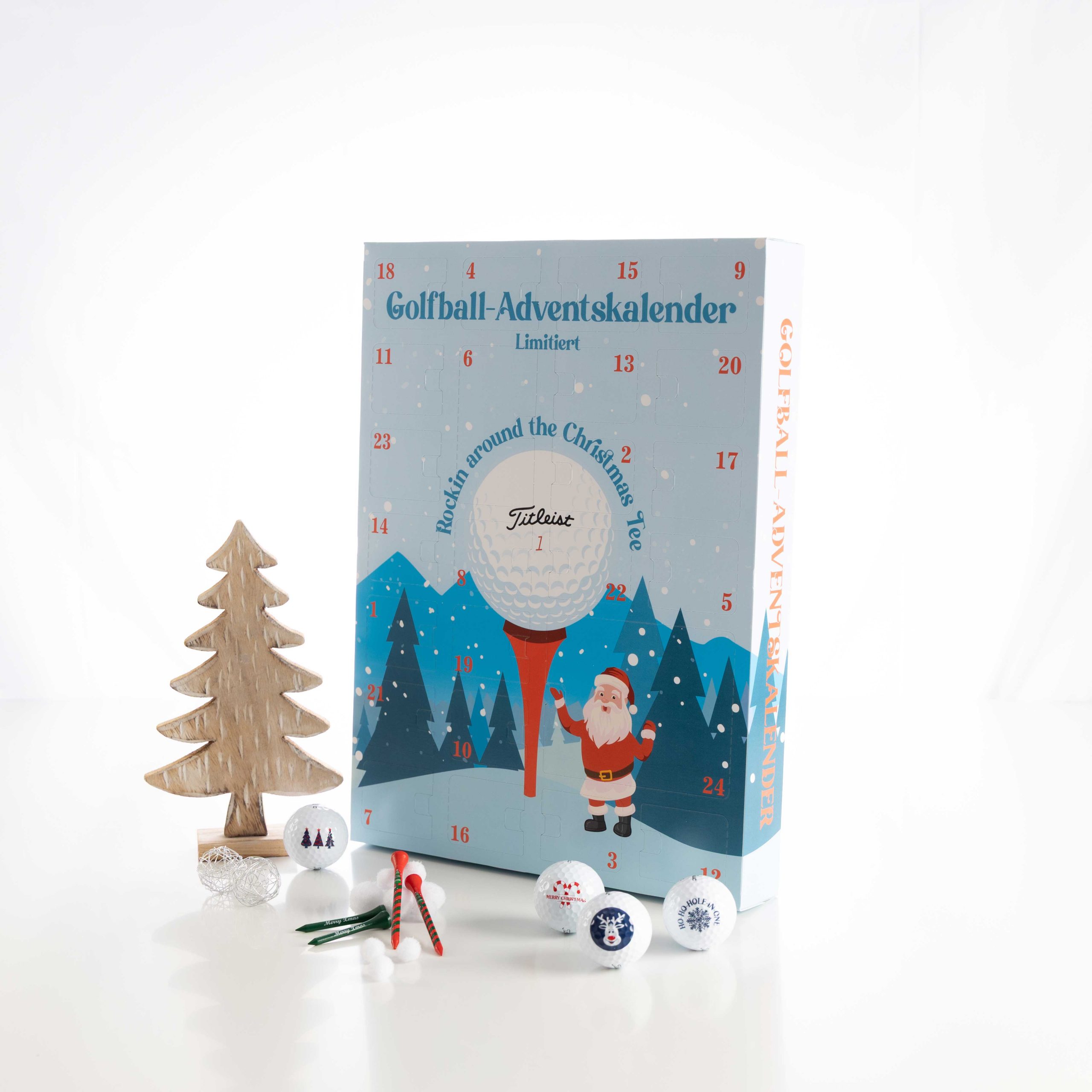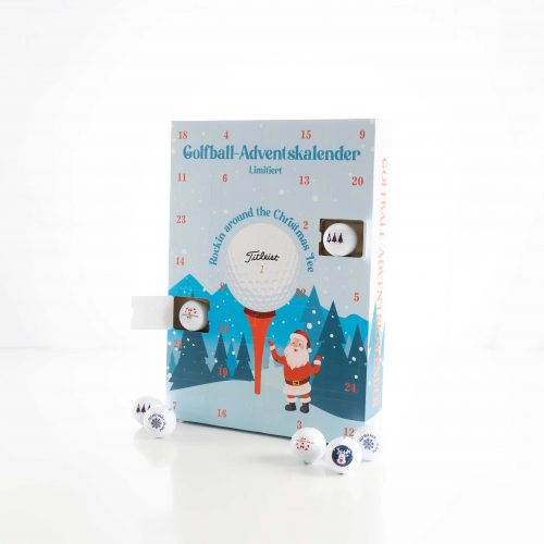 Der Kalender beinhaltet 12 Golfbälle (wahlweise Titleist TruFeel oder Pro V1) mit weihnachtlichen Motiven, dazu Süßigkeiten von Bahlsen, Milka, Lindt und Riegelein sowie nützliche Golf-Accessoires.